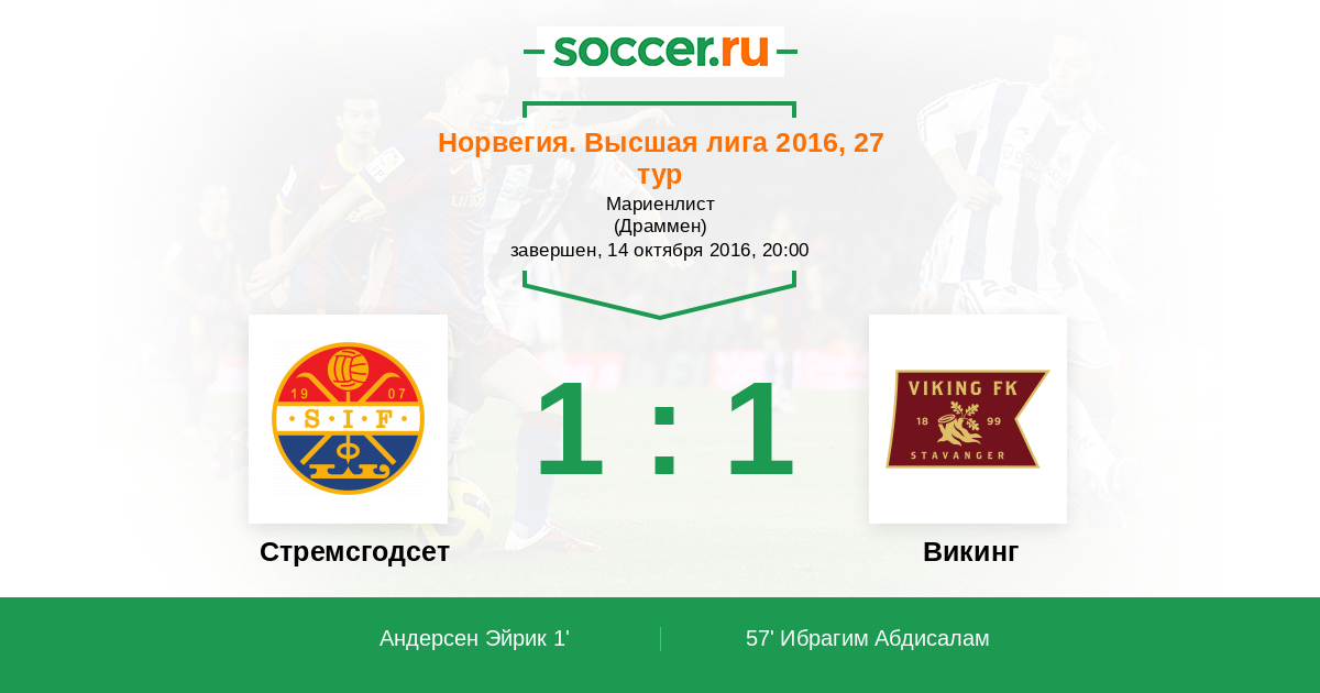 Норвегия. Высшая лига 18.09.2015 Викинг Логотип футбольный клуб Викинг (Ставангер) 1:1 Логотип футбольный клуб Стремсгодсет (Драммен) Стремсгодсет