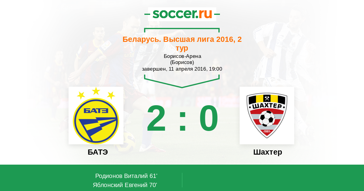 Беларусь. Высшая лига 30.04.2011 Шахтер Логотип футбольный клуб Шахтер (Солигорск) 0:2 Логотип футбольный клуб БАТЭ (Борисов) БАТЭ