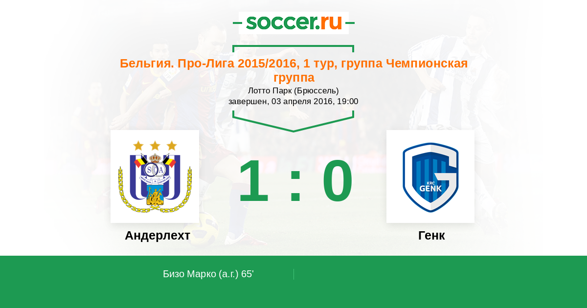 Бельгия. Про-Лига 13.09.2015 Андерлехт Логотип футбольный клуб Андерлехт (Брюссель) 0:0 Логотип футбольный клуб Генк Генк