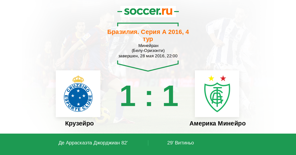 Бразилия. Лига Минейро 16.04.2016 Америка Минейро Логотип футбольный клуб Америка Минейро (Белу-Оризонти) 2:0 Логотип футбольный клуб Крузейро (Белу-Оризонти) Крузейро