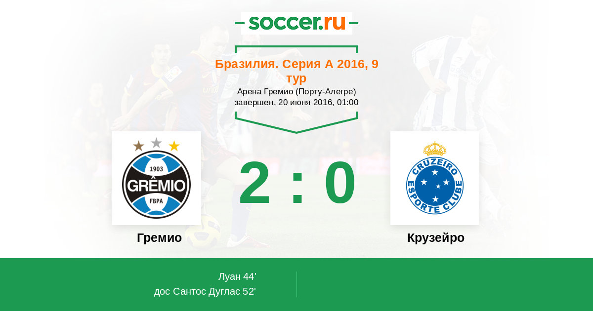 Бразилия. Серия А 02.10.2016 Крузейро Логотип футбольный клуб Крузейро (Белу-Оризонти) 1:0 Логотип футбольный клуб Гремио (Порту-Алегри) Гремио
