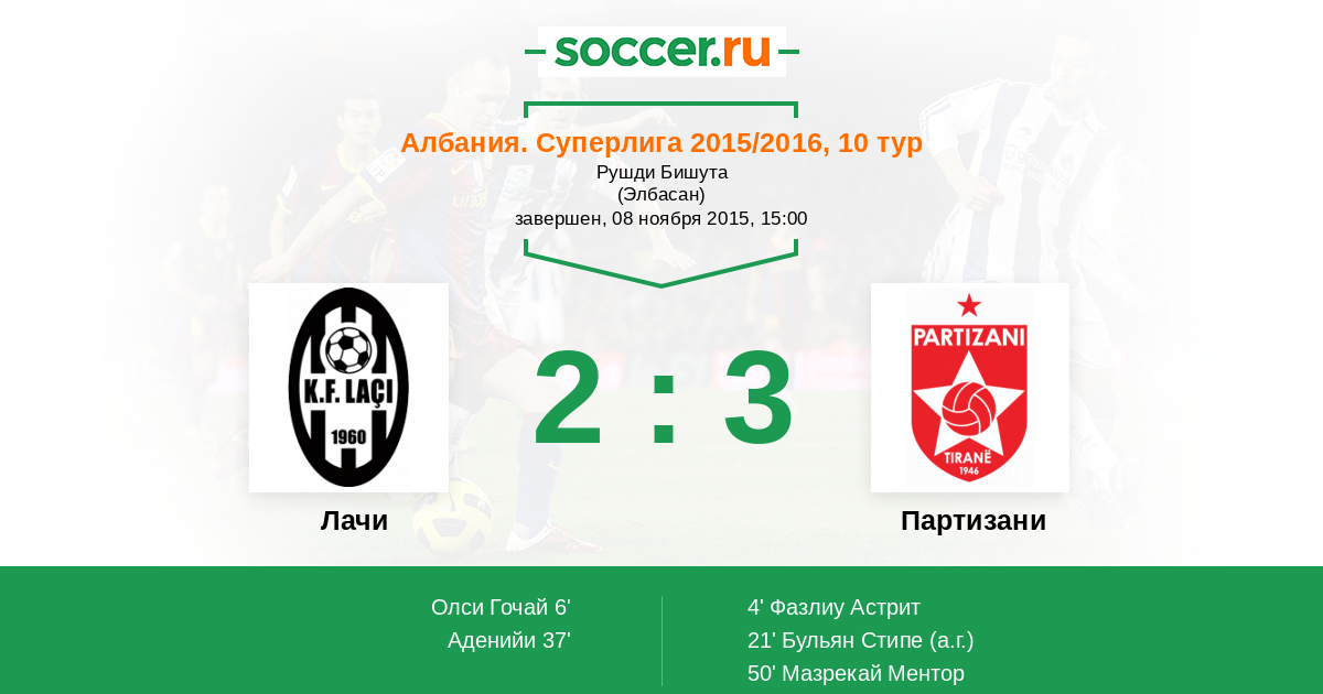 Албания. Суперлига 02.04.2016 Лачи Логотип футбольный клуб Лачи 0:0 Логотип футбольный клуб Партизани (Тирана) Партизани