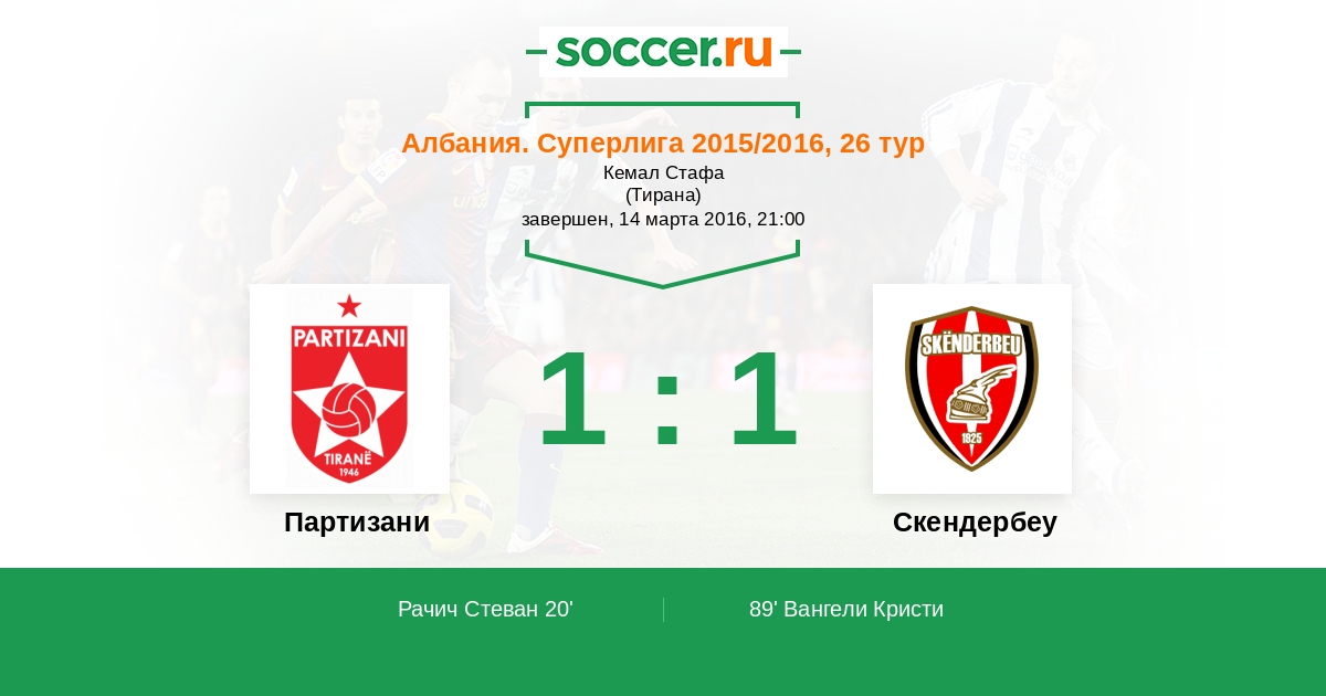 Албания. Суперлига 11.09.2014 Партизани Логотип футбольный клуб Партизани (Тирана) 1:0 Логотип футбольный клуб Скендербеу (Корча) Скендербеу