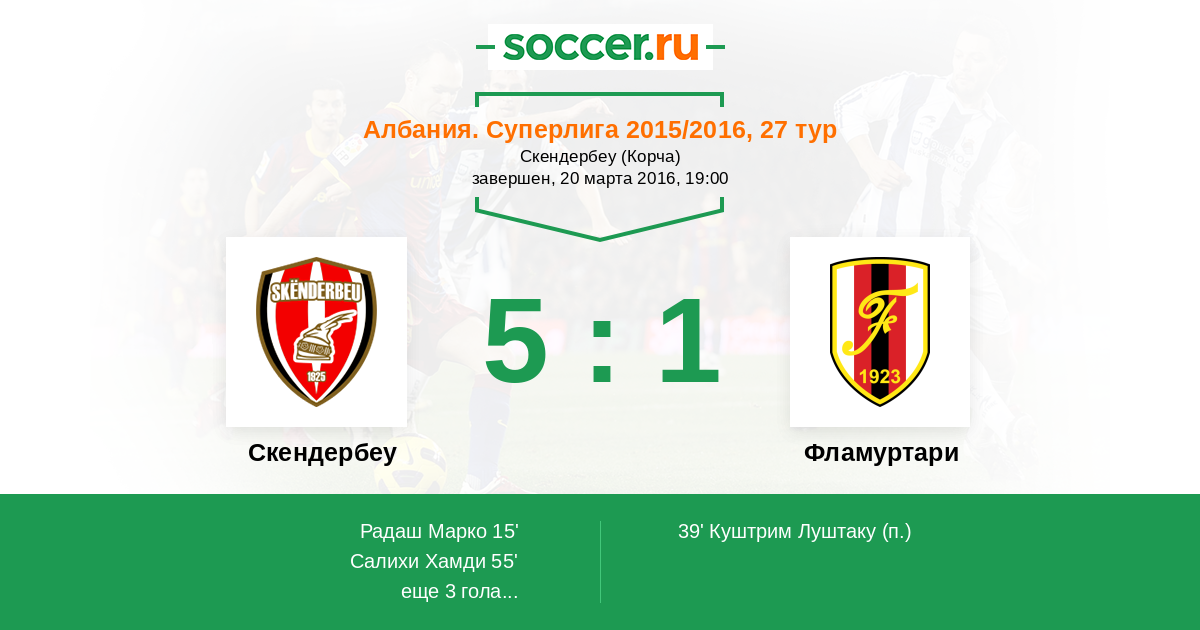 Албания. Суперлига 05.11.2016 Фламуртари Логотип футбольный клуб Фламуртари (Влера) 2:0 Логотип футбольный клуб Скендербеу (Корча) Скендербеу