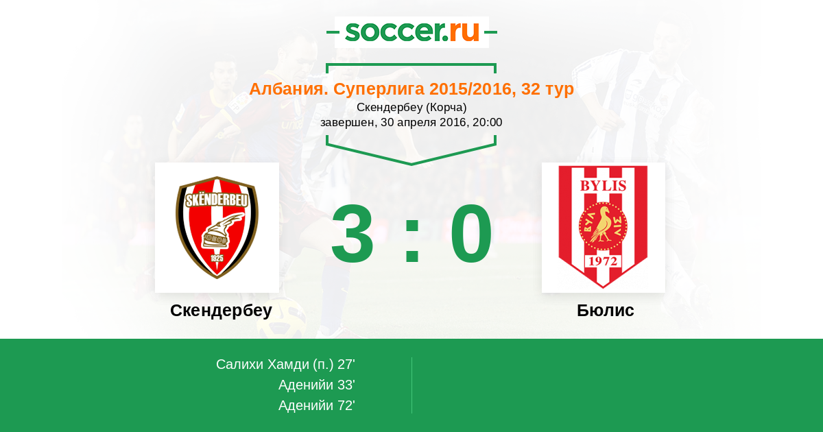 Албания. Суперлига 26.09.2015 Бюлис Логотип футбольный клуб Бюлис (Баллш) 1:4 Логотип футбольный клуб Скендербеу (Корча) Скендербеу