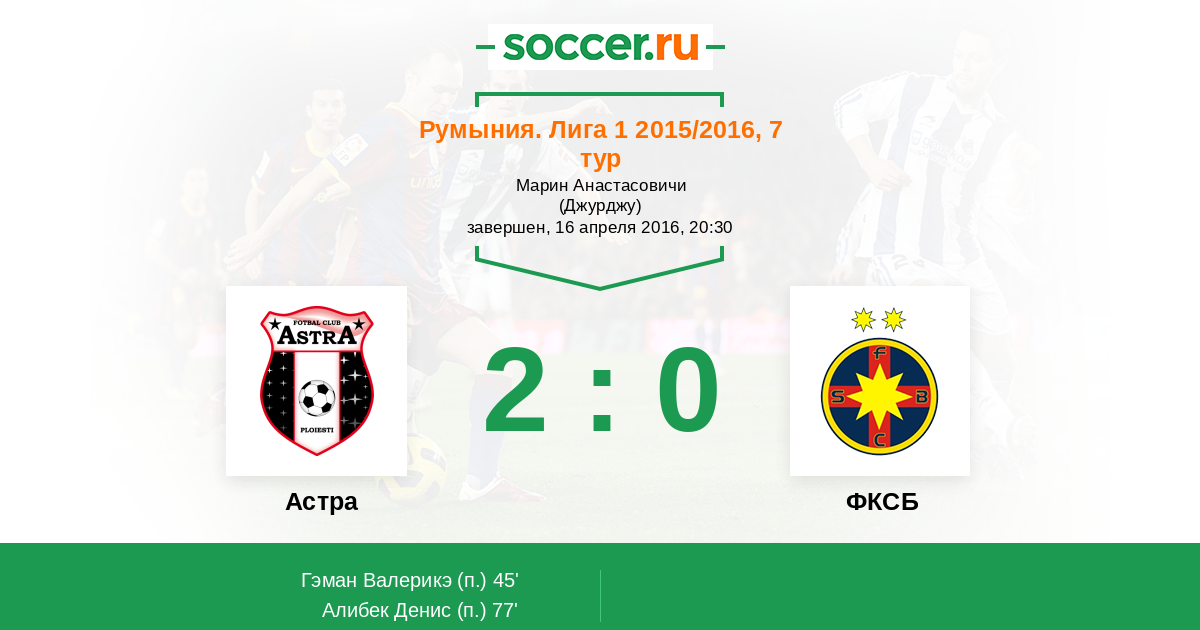 Румыния. Лига 1 13.03.2016 Стяуа Логотип футбольный клуб Стяуа (Бухарест) 2:0 Логотип футбольный клуб Астра (Джурджу) Астра