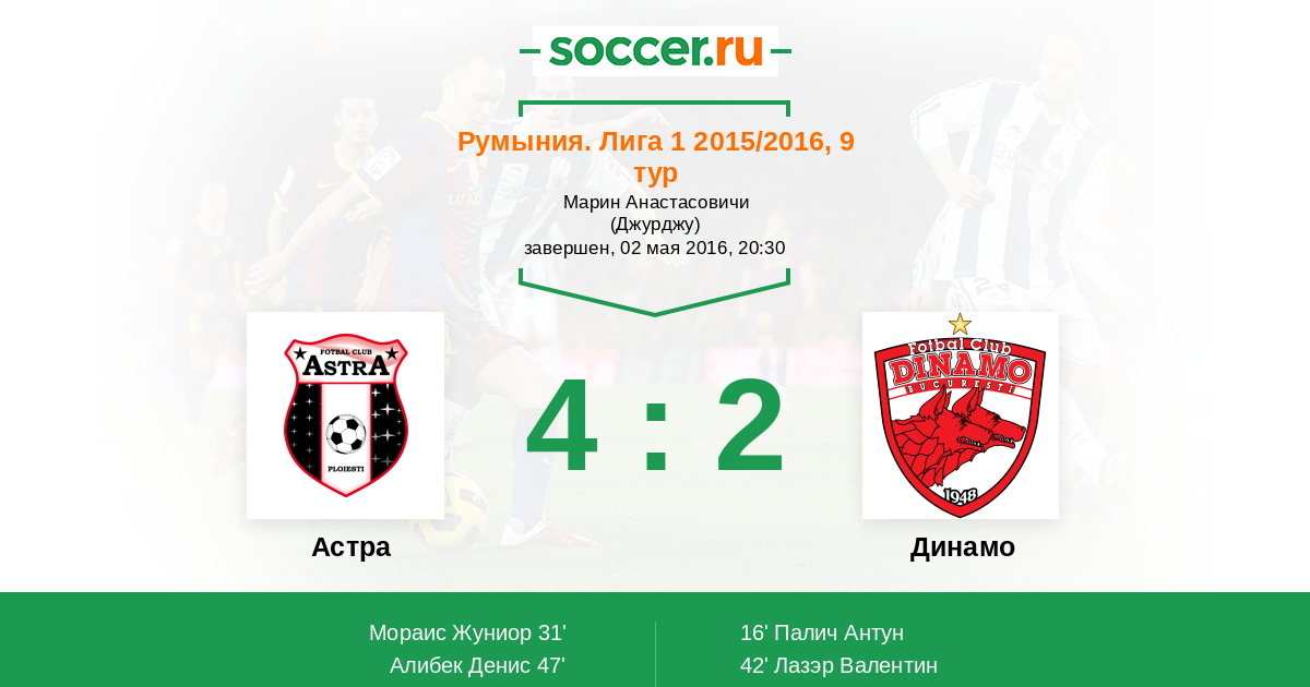 Румыния. Лига 1 01.04.2016 Динамо Логотип футбольный клуб Динамо (Бухарест) 1:4 Логотип футбольный клуб Астра (Джурджу) Астра