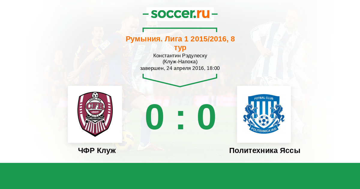 Румыния. Лига 1 21.11.2015 ЧФР Клуж Логотип футбольный клуб ЧФР Клуж (Бухарест) 0:0 Логотип футбольный клуб Политехника Яссы Политехника Яссы