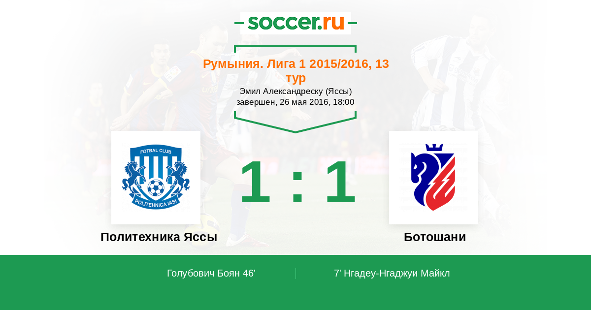 Румыния. Лига 1 11.04.2016 Ботошани Логотип футбольный клуб Ботошани 0:0 Логотип футбольный клуб Политехника Яссы Политехника Яссы