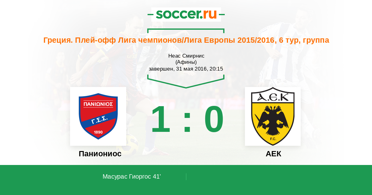 Греция. Суперлига 20.05.2016 АЕК Логотип футбольный клуб АЕК (Афины) 1:0 Логотип футбольный клуб Паниониос (Афины) Паниониос