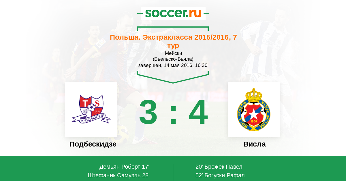 Польша. Экстракласса 17.04.2015 Подбескидзе Логотип футбольный клуб Подбескидзе (Бельско-Бяла) 2:2 Логотип футбольный клуб Висла (Краков) Висла