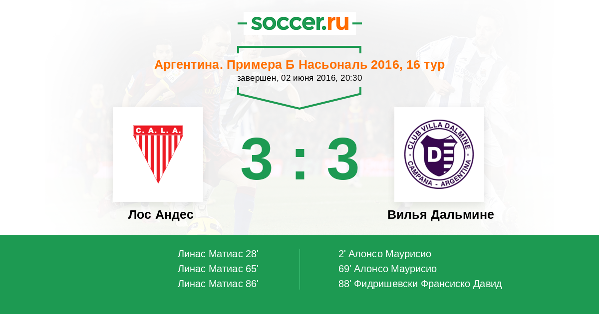 Аргентина. Примера Б Насьональ 31.10.2015 Лос Андес Логотип футбольный клуб Лос Андес (Ломас-де-Самора) 0:1 Логотип футбольный клуб Вилья Дальмине (Кампана) Вилья Дальмине