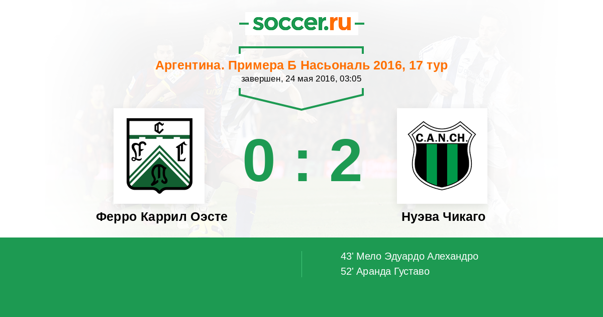 Аргентина. Примера Б Насьональ 05.11.2014 Ферро Каррил Оэсте Логотип футбольный клуб Ферро Каррил Оэсте (Буэнос-Айрес) 1:0 Логотип футбольный клуб Нуэва Чикаго ( Матадерос) Нуэва Чикаго