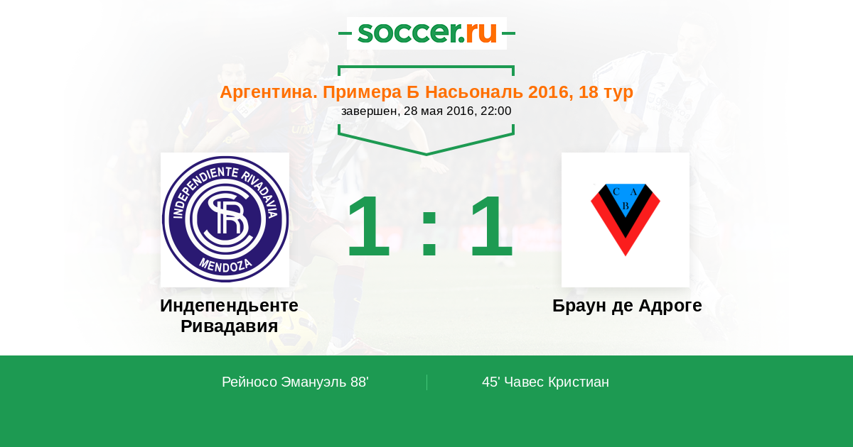 Аргентина. Примера Б Насьональ 29.07.2017 Браун де Адроге Логотип футбольный клуб Браун де Адроге 1:0 Логотип футбольный клуб Индепендьенте Ривадавия (Мендоса) Индепендьенте Ривадавия