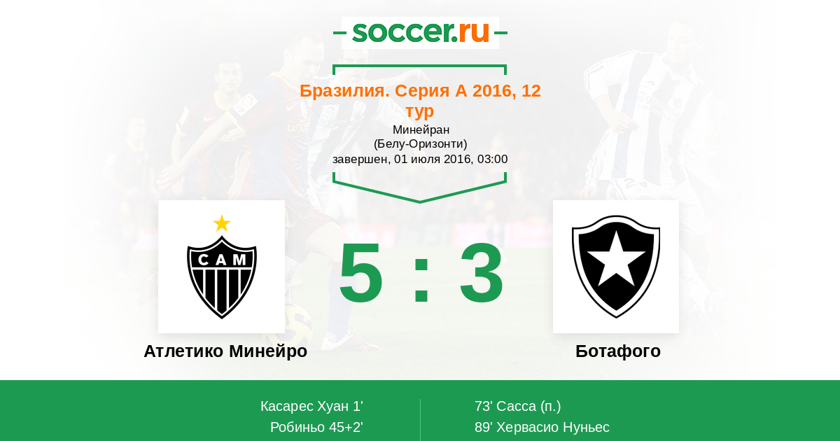 Бразилия. Серия А 16.10.2016 Ботафого Логотип футбольный клуб Ботафого (Рио-де-Жанейро) 3:2 Логотип футбольный клуб Атлетико Минейро (Белу-Оризонти) Атлетико Минейро