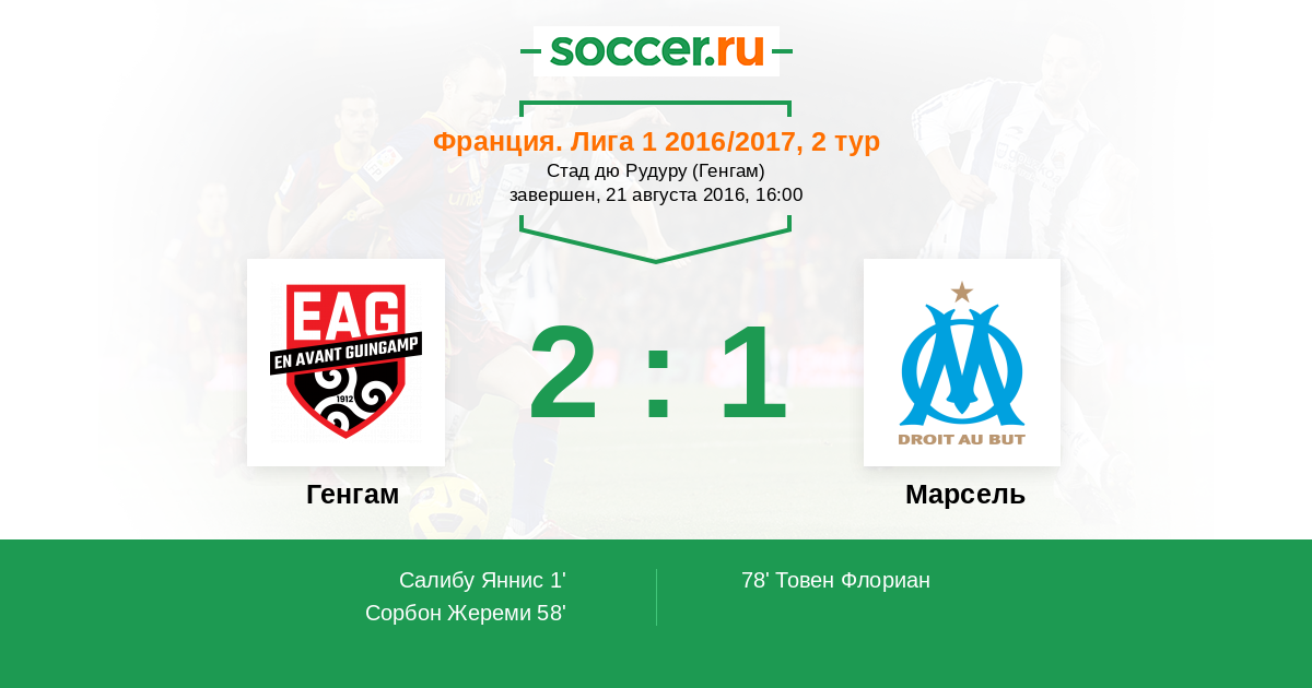 Франция. Лига 1 08.02.2017 Марсель Логотип футбольный клуб Марсель 2:0 Логотип футбольный клуб Генгам Генгам