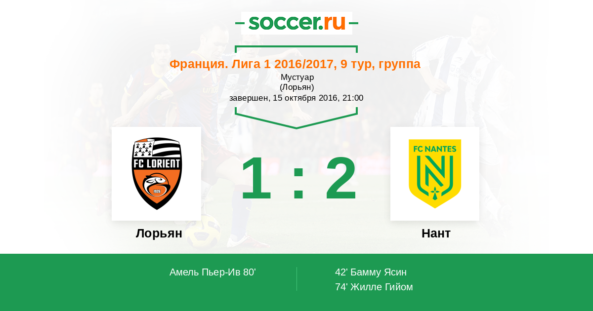 Франция. Лига 1 19.12.2015 Лорьян Логотип футбольный клуб Лорьян 0:0 Логотип футбольный клуб Нант Нант