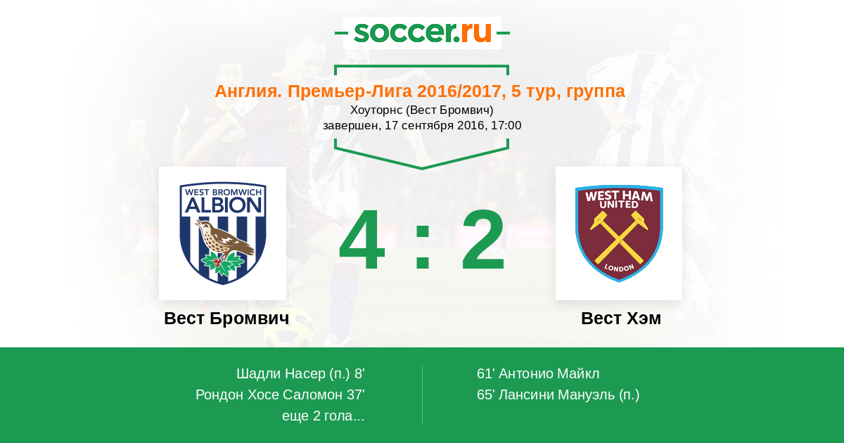 Англия. Премьер-Лига 16.09.2017 Вест Бромвич Логотип футбольный клуб Вест Бромвич 0:0 Логотип футбольный клуб Вест Хэм (Лондон) Вест Хэм