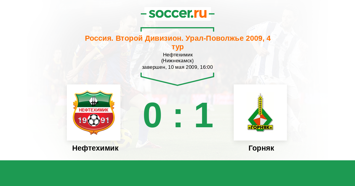 Россия. Вторая лига. Группа 4 25.04.2010 Горняк Логотип футбольный клуб Горняк (Учалы) 1:1 Логотип футбольный клуб Нефтехимик (Нижнекамск) Нефтехимик