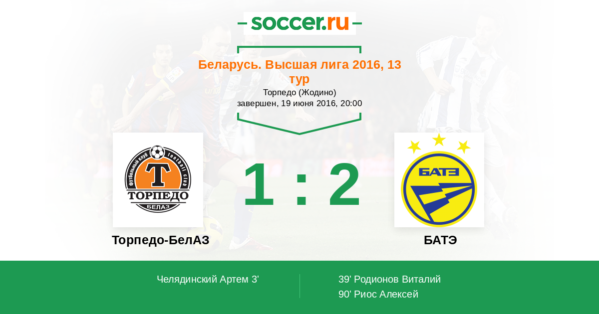 Беларусь. Высшая лига 20.06.2017 БАТЭ Логотип футбольный клуб БАТЭ (Борисов) 0:0 Логотип футбольный клуб Торпедо-БелАЗ (Жодино) Торпедо-БелАЗ