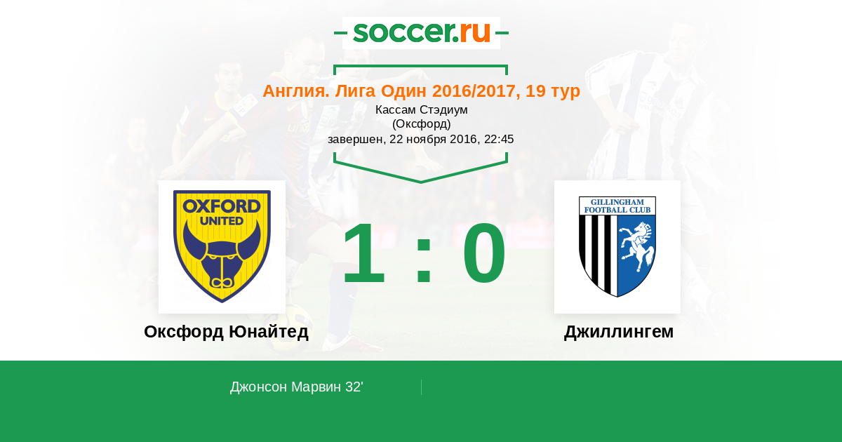 Англия. Первая Футбольная Лига 17.11.2018 Оксфорд Юнайтед Логотип футбольный клуб Оксфорд Юнайтед 1:0 Логотип футбольный клуб Джиллингем Джиллингем