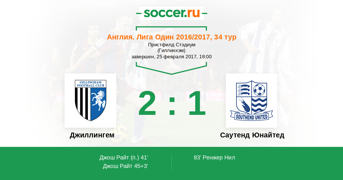 Англия. Первая Футбольная Лига 19.03.2016 Саутенд Юнайтед Логотип футбольный клуб Саутенд Юнайтед (Саутенд-он-Си) 1:1 Логотип футбольный клуб Джиллингем Джиллингем