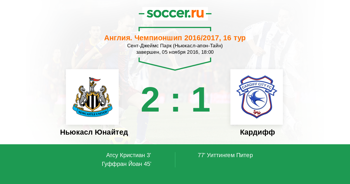 Англия. Чемпионшип 28.04.2017 Кардифф Логотип футбольный клуб Кардифф 0:2 Логотип футбольный клуб Ньюкасл Юнайтед (Ньюкасл-апон-Тайн) Ньюкасл Юнайтед