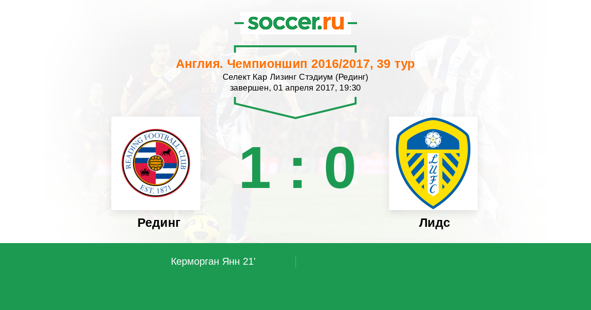 Англия. Чемпионшип 13.12.2016 Лидс Логотип футбольный клуб Лидс 2:0 Логотип футбольный клуб Рединг Рединг