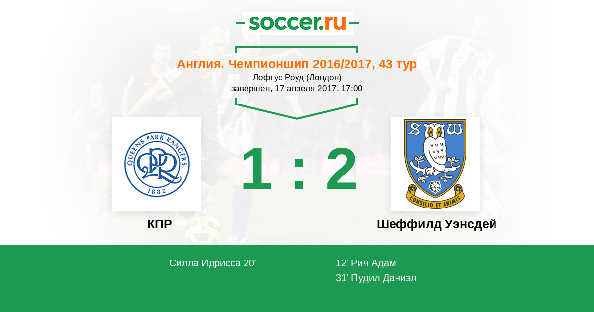 Англия. Чемпионшип 10.04.2018 КПР Логотип футбольный клуб КПР (Лондон) 4:2 Логотип футбольный клуб Шеффилд Уэнсдей Шеффилд Уэнсдей
