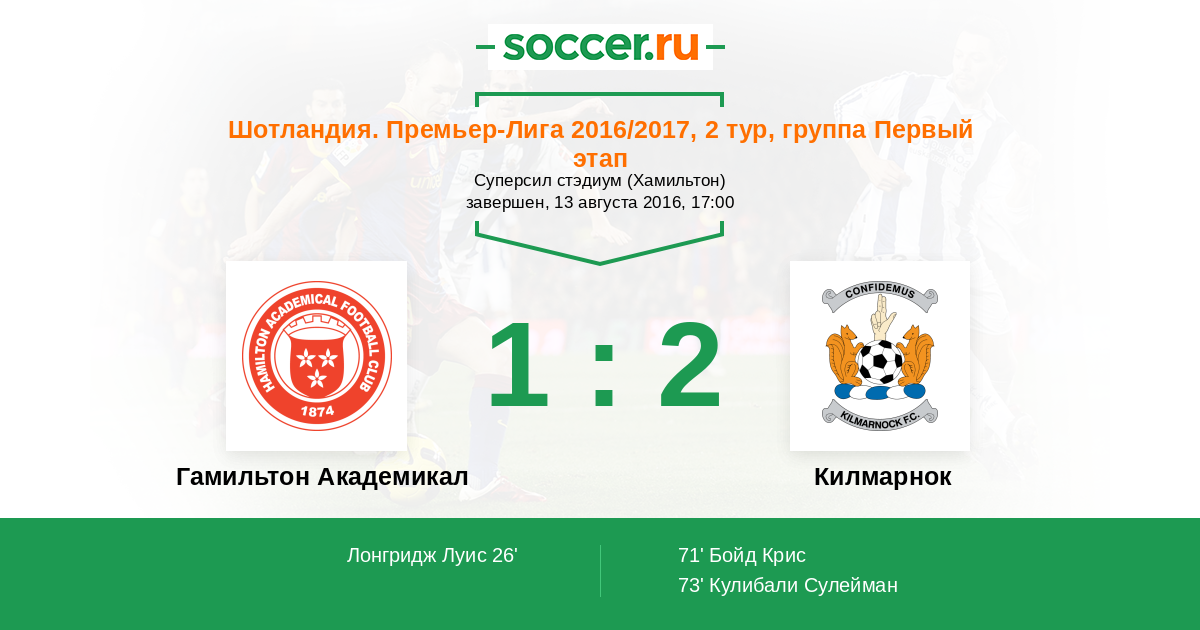 Шотландия. Премьер-Лига 26.08.2017 Килмарнок Логотип футбольный клуб Килмарнок 2:2 Логотип футбольный клуб Гамильтон Академикал Гамильтон Академикал