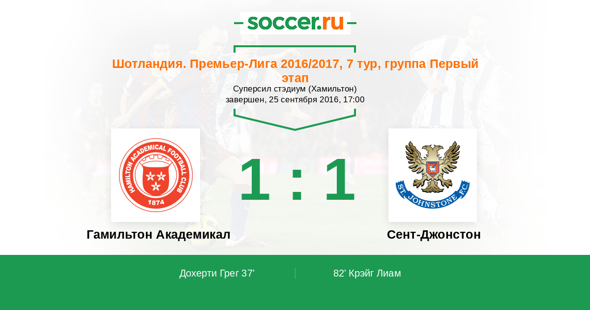 Шотландия. Премьер-Лига 23.09.2017 Сент-Джонстон Логотип футбольный клуб Сент-Джонстон (Перт) 2:1 Логотип футбольный клуб Гамильтон Академикал Гамильтон Академикал