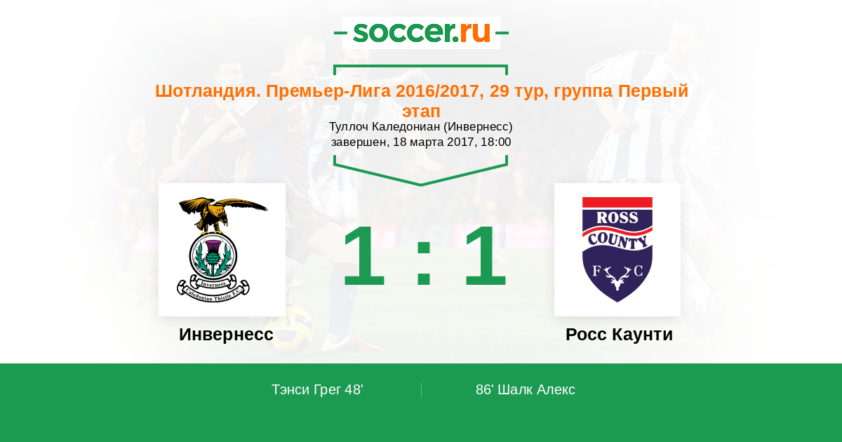 Шотландия. Премьер-Лига 28.04.2017 Росс Каунти Логотип футбольный клуб Росс Каунти (Дингволл) 4:0 Логотип футбольный клуб Инвернесс Инвернесс