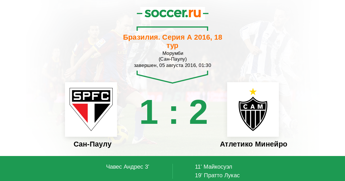 Бразилия. Серия А 06.05.2018 Сан-Паулу Логотип футбольный клуб Сан-Паулу 2:2 Логотип футбольный клуб Атлетико Минейро (Белу-Оризонти) Атлетико Минейро