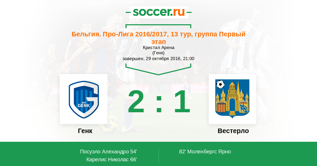 Бельгия. Про-Лига 19.10.2014 Генк Логотип футбольный клуб Генк 3:1 Логотип футбольный клуб Вестерло Вестерло
