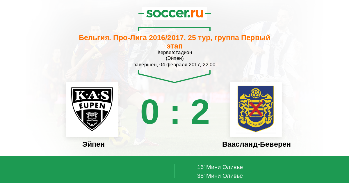 Бельгия. Про-Лига 15.10.2016 Ваасланд-Беверен Логотип футбольный клуб Ваасланд-Беверен 4:2 Логотип футбольный клуб Эйпен Эйпен