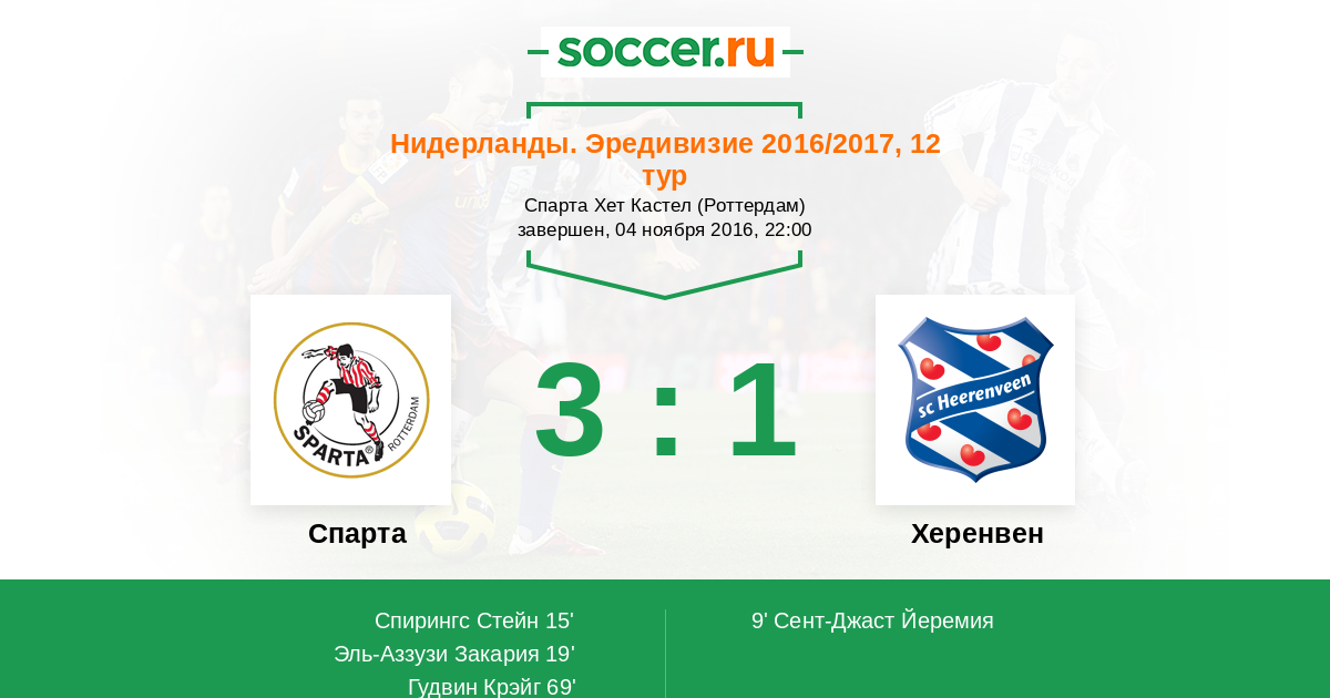 Нидерланды. Эредивизи 03.11.2017 Спарта Логотип футбольный клуб Спарта (Роттердам) 0:0 Логотип футбольный клуб Херенвен Херенвен