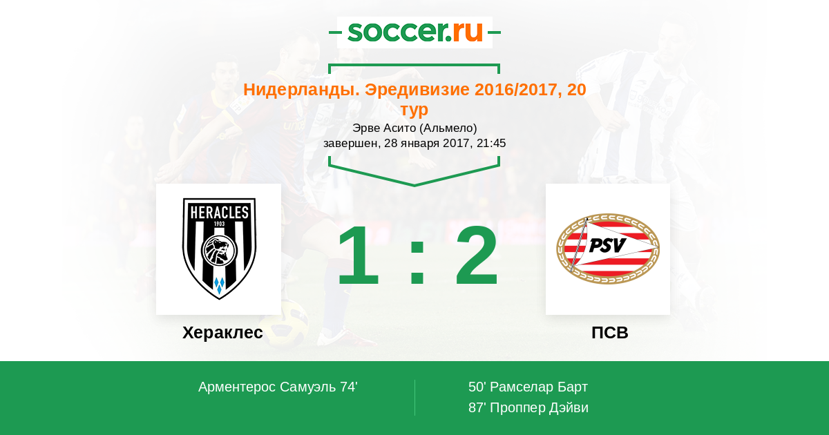 Нидерланды. Эредивизи 20.02.2016 ПСВ Логотип футбольный клуб ПСВ (Эйндховен) 2:0 Логотип футбольный клуб Хераклес (Алмело) Хераклес