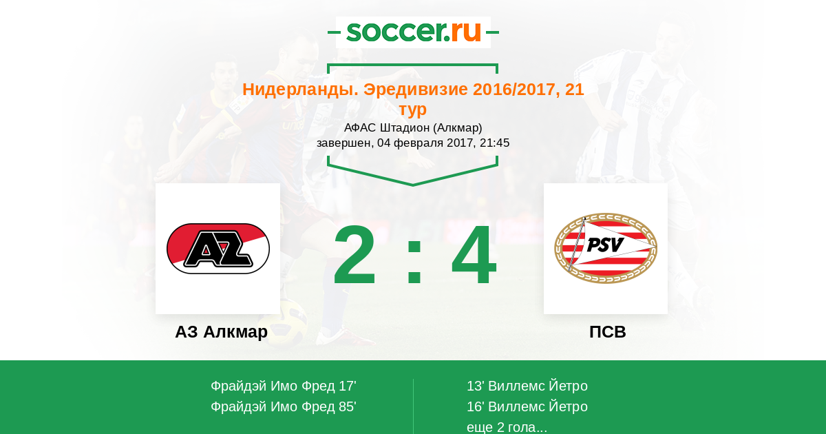 Нидерланды. Эредивизи 13.02.2015 АЗ Алкмар Логотип футбольный клуб АЗ Алкмар 2:4 Логотип футбольный клуб ПСВ (Эйндховен) ПСВ