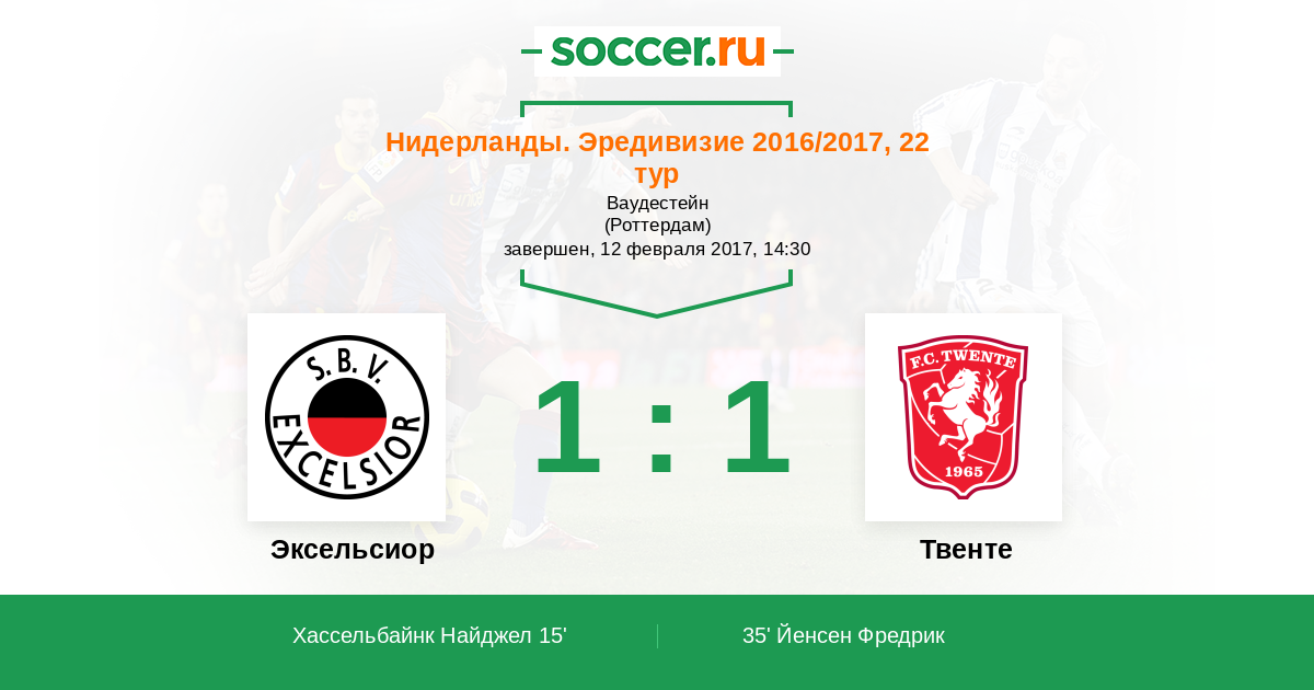 Нидерланды. Эредивизи 05.12.2015 Эксельсиор Логотип футбольный клуб Эксельсиор (Роттердам) 1:1 Логотип футбольный клуб Твенте (Энсхеде) Твенте