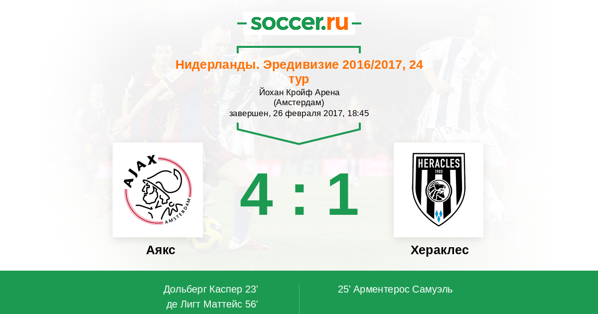 Нидерланды. Эредивизи 26.01.2016 Аякс Логотип футбольный клуб Аякс (Амстердам) 0:0 Логотип футбольный клуб Хераклес (Алмело) Хераклес