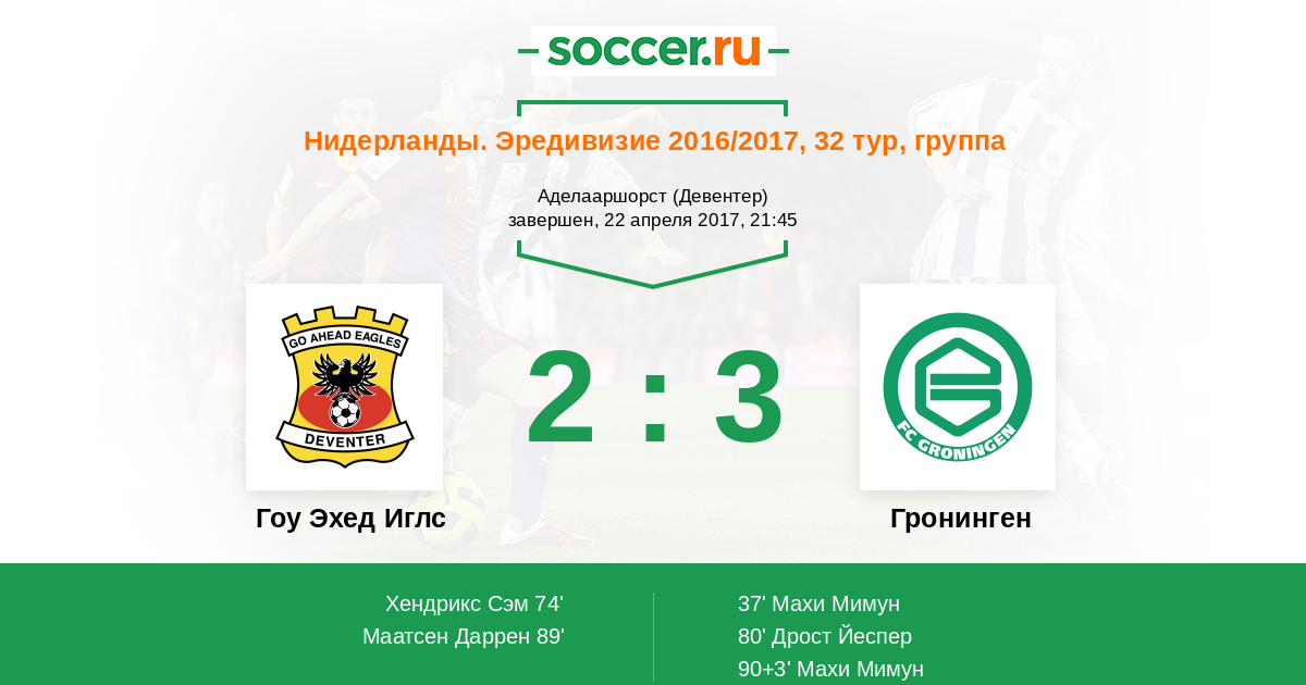 Нидерланды. Эредивизи 18.12.2016 Гронинген Логотип футбольный клуб Гронинген 1:1 Логотип футбольный клуб Гоу Эхед Иглс (Девентер) Гоу Эхед Иглс