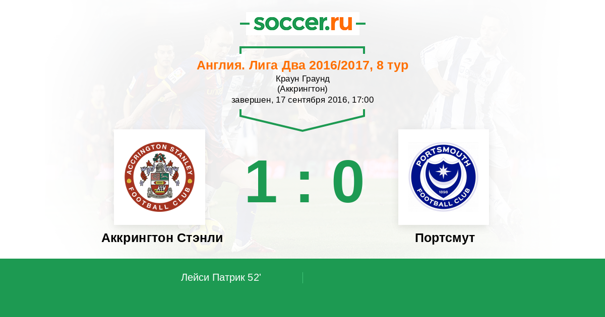 Англия. Вторая Футбольная Лига 11.02.2017 Портсмут Логотип футбольный клуб Портсмут 2:0 Логотип футбольный клуб Аккрингтон Стэнли Аккрингтон Стэнли