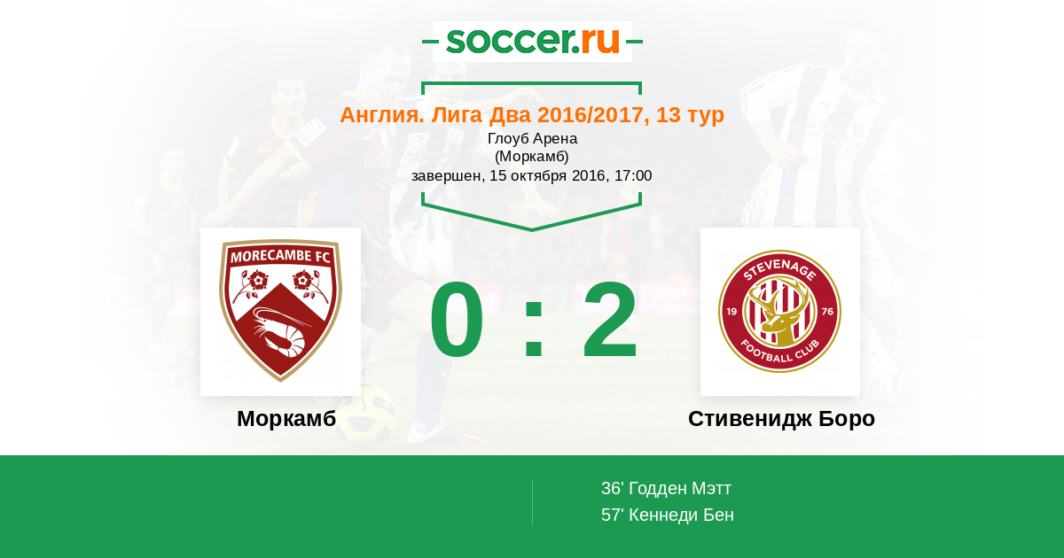 Англия. Вторая Футбольная Лига 14.04.2017 Стивенидж Боро Логотип футбольный клуб Стивенидж Боро (Стивэнейдж) 0:1 Логотип футбольный клуб Моркамб Моркамб