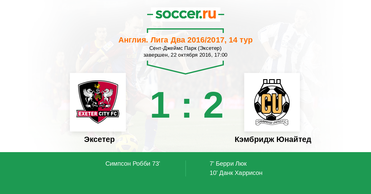 Англия. Вторая Футбольная Лига 05.03.2016 Кэмбридж Юнайтед Логотип футбольный клуб Кэмбридж Юнайтед 0:1 Логотип футбольный клуб Эксетер Эксетер