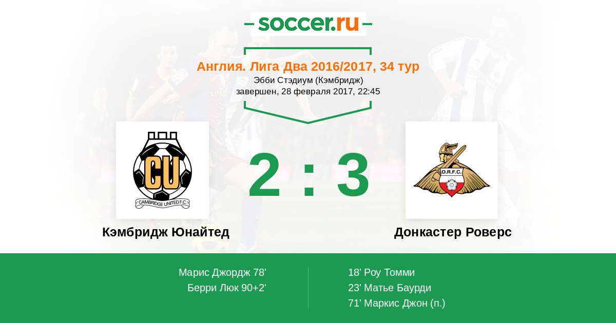 Англия. Вторая Футбольная Лига 16.08.2016 Донкастер Роверс Логотип футбольный клуб Донкастер Роверс 1:0 Логотип футбольный клуб Кэмбридж Юнайтед Кэмбридж Юнайтед