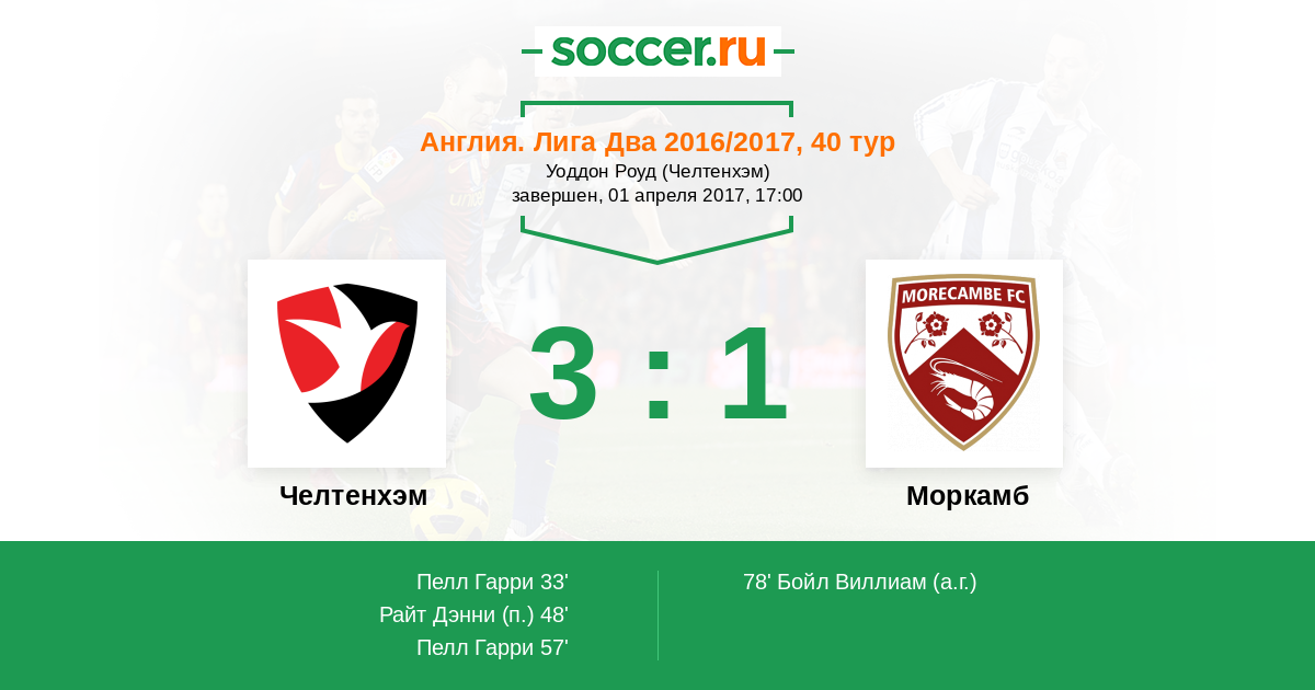 Англия. Вторая Футбольная Лига 07.04.2018 Челтенхэм Логотип футбольный клуб Челтенхэм 3:0 Логотип футбольный клуб Моркамб Моркамб