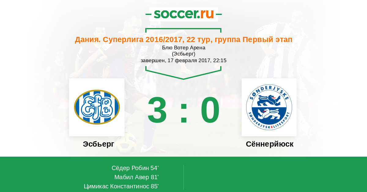 Дания. Суперлига 28.08.2016 Сённерйюск Логотип футбольный клуб Сённерйюск (Хадерслев) 1:1 Логотип футбольный клуб Эсбьерг Эсбьерг