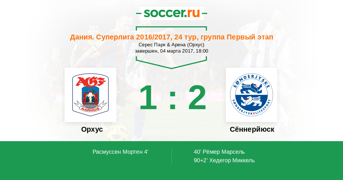 Дания. Суперлига 02.04.2012 Орхус Логотип футбольный клуб Орхус 1:3 Логотип футбольный клуб Сённерйюск (Хадерслев) Сённерйюск