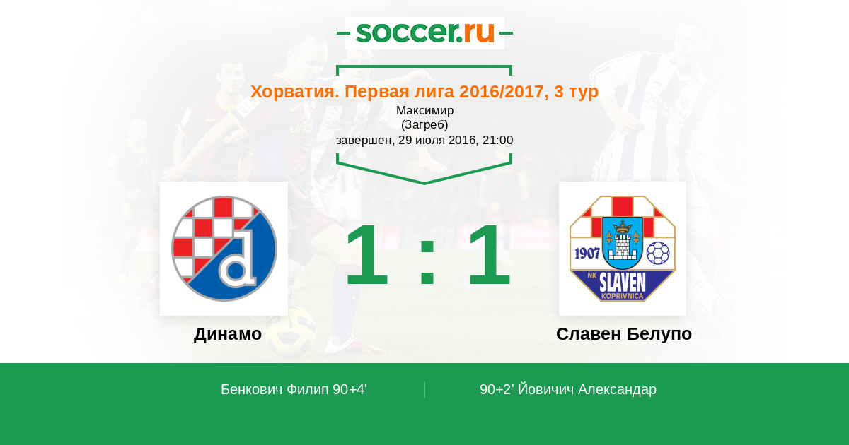 Хорватия. Первая лига 06.03.2016 Динамо Логотип футбольный клуб Динамо (Загреб) 2:1 Логотип футбольный клуб Славен Белупо (Копривница) Славен Белупо