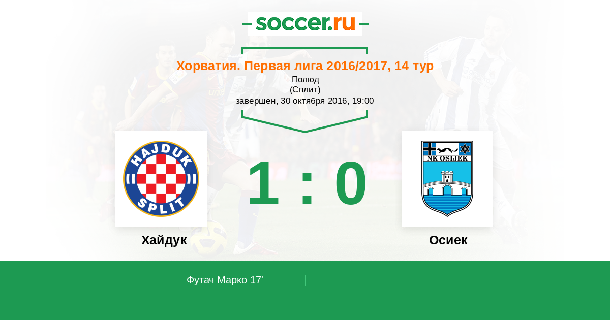 Хорватия. Первая лига 14.08.2016 Осиек Логотип футбольный клуб Осиек 1:1 Логотип футбольный клуб Хайдук (Сплит) Хайдук